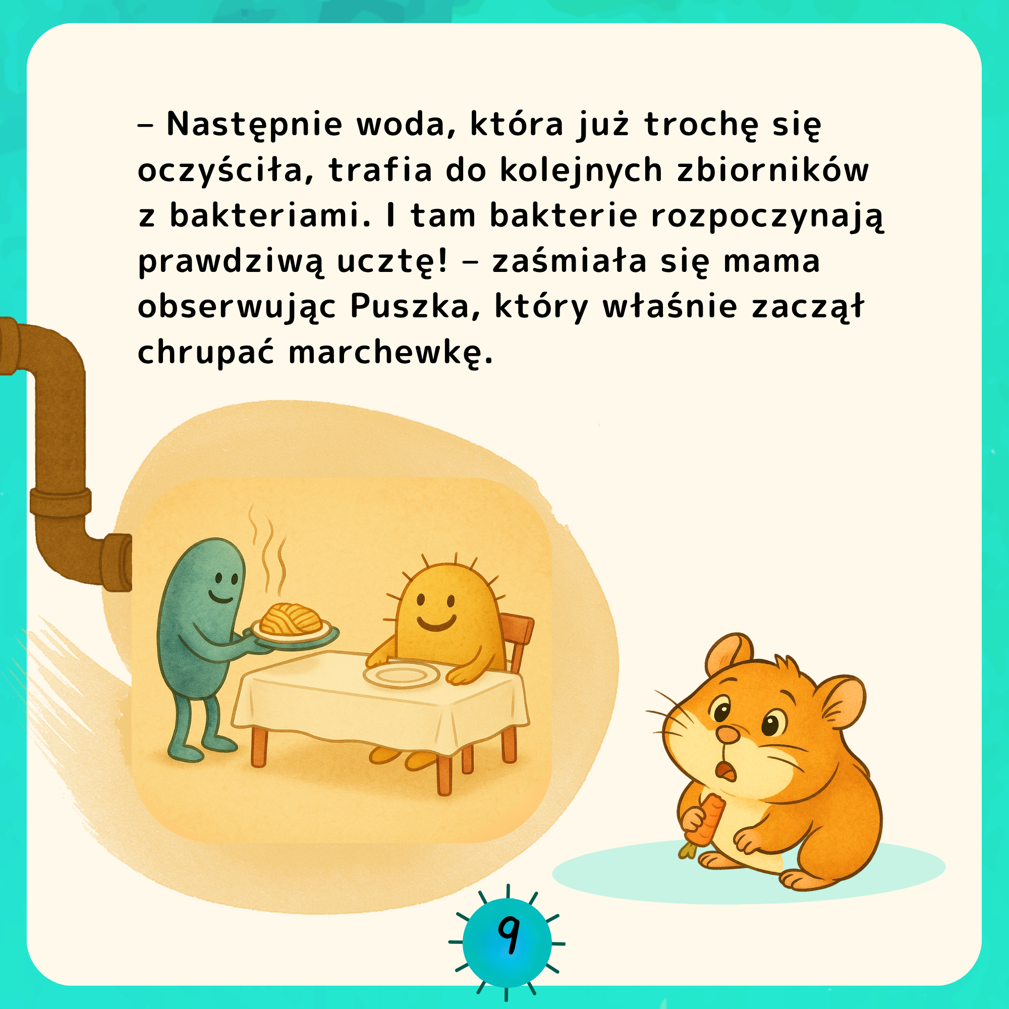 Książeczka w prosty i zabawny sposób pokazuje, jak działa oczyszczalnia ścieków, jak bakterie „zjadają” zanieczyszczenia i dlaczego są naszymi sprzymierzeńcami w trosce o czystą planetę.
